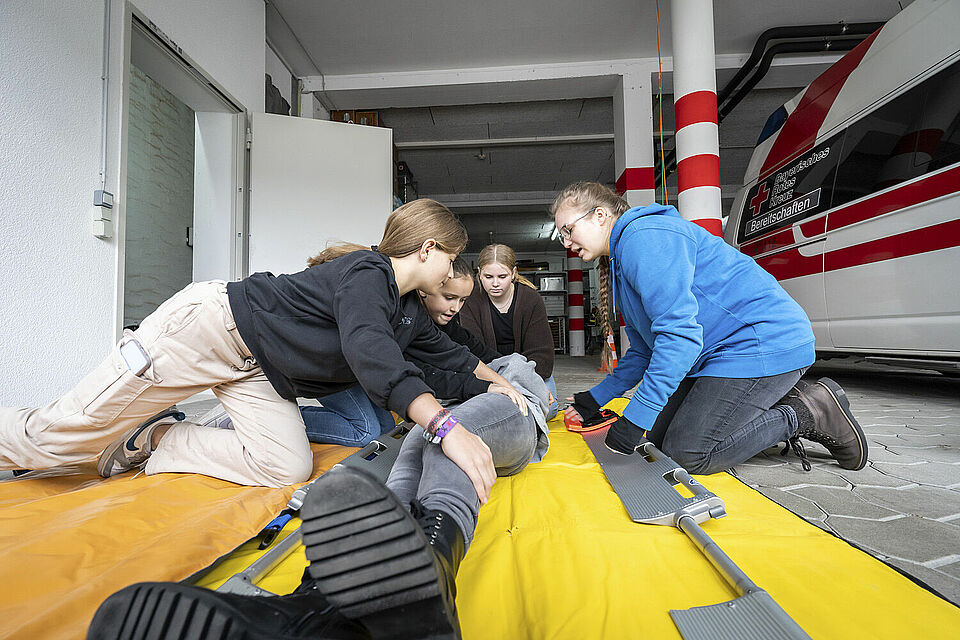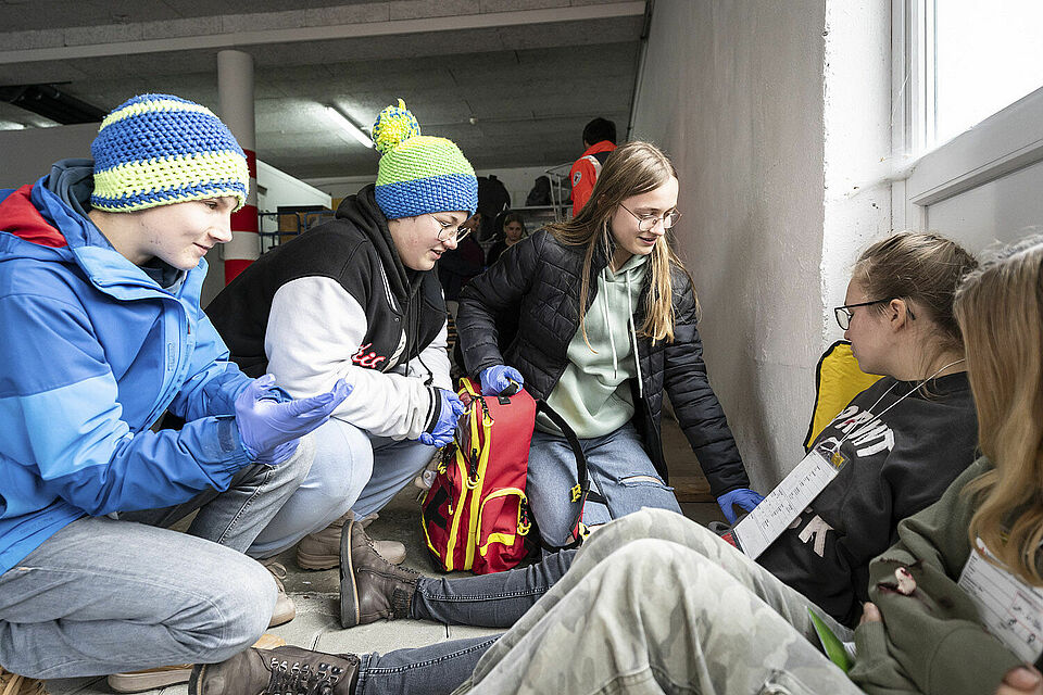 Am nächsten Tag, nachdem wir ausgiebig gefrühstückt haben, wurden die JRKler:innen in die Rettungsdienst-Welt eingeführt, in der sie viel über das Funken und die Einsatztaktik lernten. Auch den Umgang mit Schaufeltrage, Vakuummatratze und vielem mehr haben sie erlernt. Nach dem Mittagessen durften die Kinder ihr erlerntes Wissen vom Vormittag einsetzen. Sie wurden in verschiedenen Einsatzautos zugeteilt und dürfen die Verletzten eines schweren Verkehrsunfall retten und versorgen. Die Mimen stellte dabei die Notfalldarstellung.