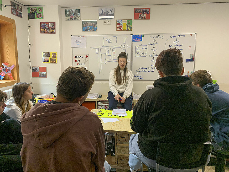 Nachdem sich die Jugendlichen und Eltern in Gruppen aufteilten, ging der „Eltern gegen Kinder“-Abend los! Als erstes war ein Quiz dran, in dem viel Erste-Hilfe-Wissen gefragt war, wobei die JRKler:innen einen eindeutigen Vorteil hatten. Danach ging es weiter mit der Reise nach Jerusalem, einem Seitenlagen-Wettbewerb, dem Kampf gegen ChatGPT und fröhlichem Lieder raten.