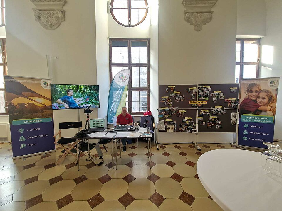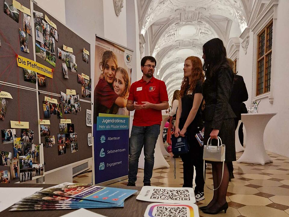 Für unser Filmteam war der Jugendempfang eine besondere Gelegenheit, das Projekt einem breiten Publikum vorzustellen. An unserem eigens aufgebauten Stand kamen wir mit vielen Besucherinnen und Besuchern ins Gespräch – darunter zahlreiche Jugendliche, pädagogische Fachkräfte sowie Vertreterinnen und Vertreter aus Politik und Verbänden. Besonders erfreulich war, dass sowohl die bayerische Familienministerin Ulrike Scharf als auch der Präsident des Bayerischen Jugendrings (BJR) unseren Stand besuchten. In persönlichen Gesprächen informierten sie sich über die Hintergründe des Projekts, die Themen des Films und die Arbeit des JRK in der Region.