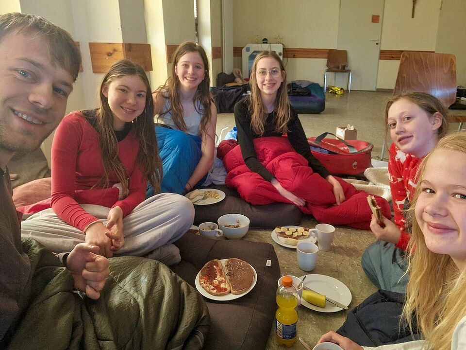 Am nächsten Morgen, nachdem alle einiegermaßen ausgeschlafen hatten, gab es ein entspanntes gemeinsames Frühstück – für manche am Tisch, für andere noch im Schlafplatz.