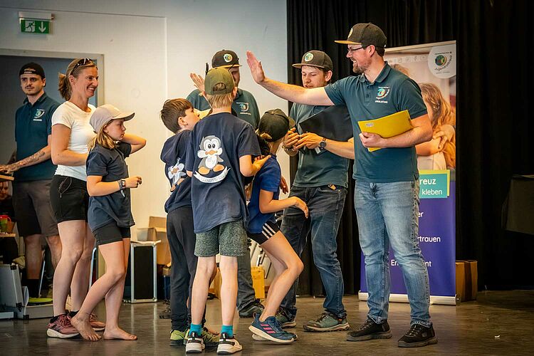 Unglaublich spannend verlief der Wettbewerb in der Stufe I. Zwischen dem ersten und dem dritten Platz lagen am Ende gerade einmal fünf Punkte. Die Rotkreuztierchen aus Weilheim schafften dabei das Kunststück der Titelverteidigung – doch es war denkbar knapp: Platz 1 und 2 trennte im Gesamtergebnis lediglich ein einziger Punkt!